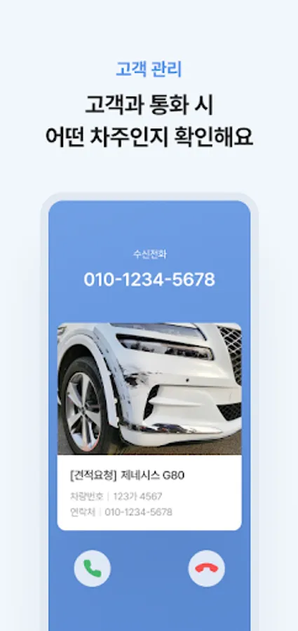 - As one of the core functions of the Cardak Partners app, when a call comes in from a customer, the customer's quote request information (car model, photo, request details, etc.) is displayed on the screen using the calling phone number. This is a function that helps you to respond smoothly to customers.