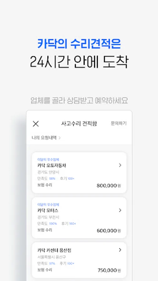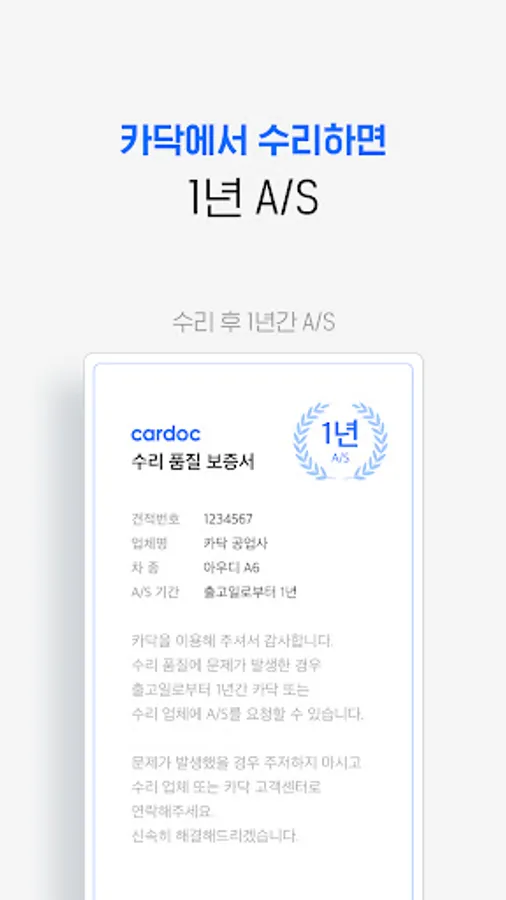 Just upload one picture of the damage to your car, and you can get quotes from an average of 5-6 repair companies for comparison. Choose a company you like and make a consultation and reservation. All Cardak repair customers are provided with a 1-year free quality warranty.