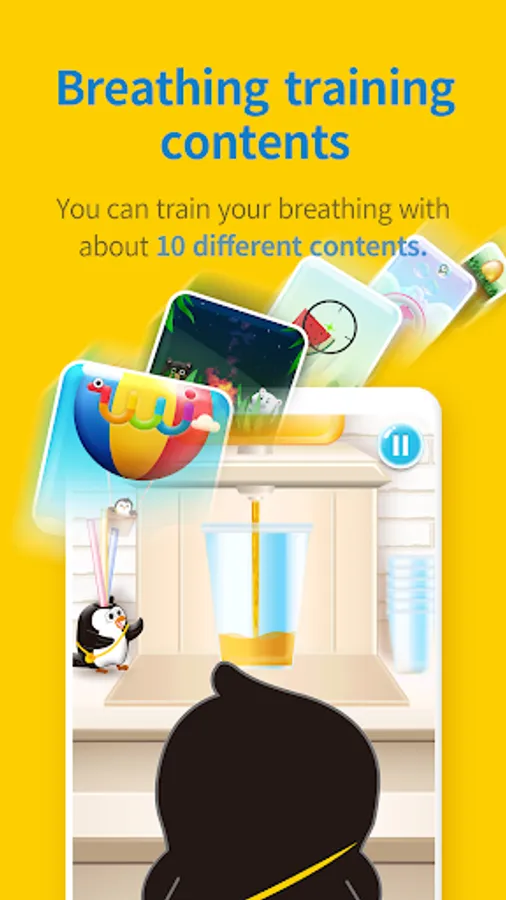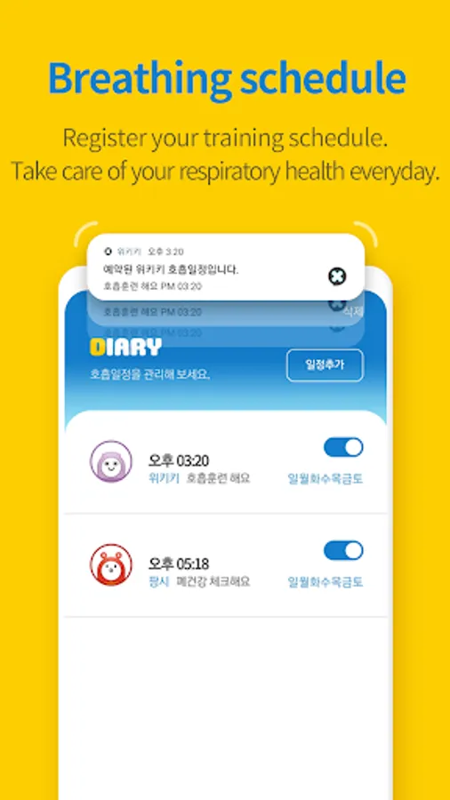 You can also meet penguin, bear, rabbit, and monkey friends that you saw in the Wikiki storybook in the Application. Children can choose, register and play their favorite characters, and they can enjoy blowing like characters in the story while it brings full amount of oxygen to their precious brain and body. In the play diary function, children can record the photos, feelings, and training of the day.