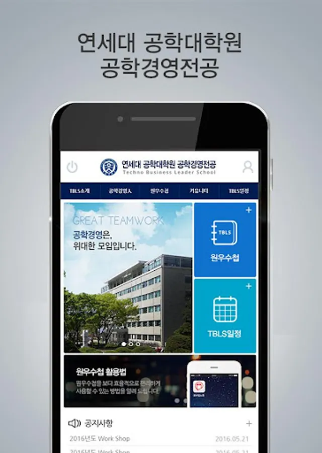 연세대학교 공학대학원 공학경영전공 동문,원우 및 교수진 정보와 전공에 관한 소식을 열람할 수 있는 모바일 전공 수첩 어플리케이션입니다.