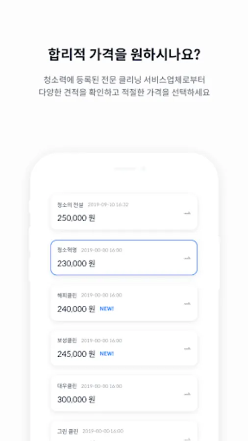 고객님이 원하시는 시간과 장소 그리고 청소 서비스와 매칭 되는 사업자 여러분이 고객님께 가격을 제안드립니다.