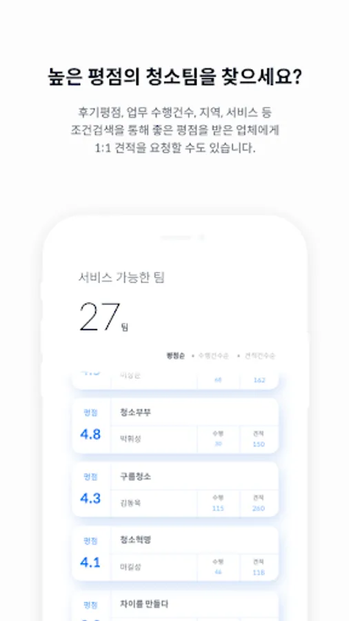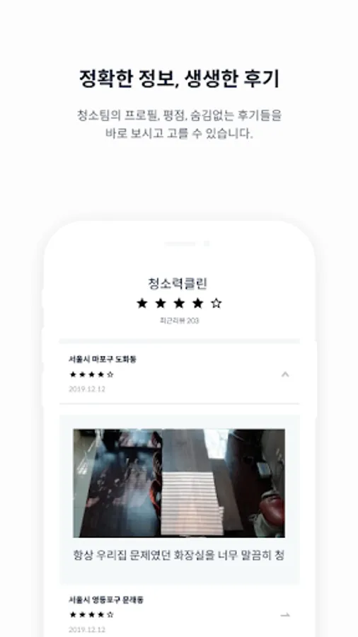 청소팀의 프로필, 평점, 숨김없는 후기들을 바로 보시고 고르 실 수 있습니다. 각 청소팀 소개페이지에는 청소팀의 사진, 사업자등록증, 기존 고객의 평점 및 서비스 이용후기, 서비스 제공 사진 등을 찾아보실 수 있어요.