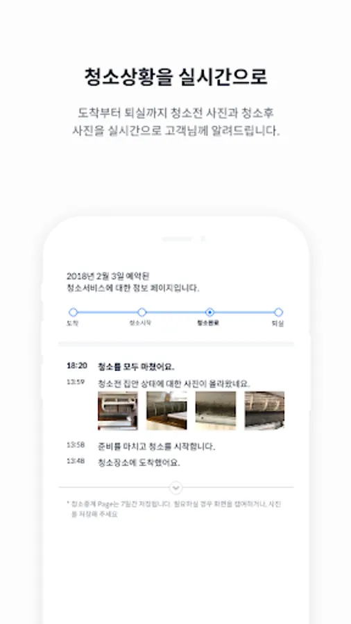 도착부터 퇴실까지 청소한 사진과 청소한 사진을 시간정보와 함께 실시간으로 고객님께 알려드려요.
