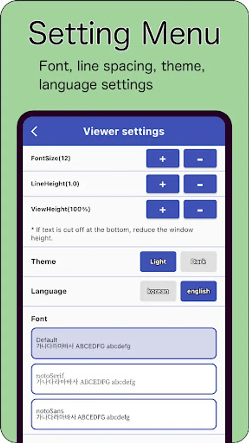 * Settings - You can set the font size, line spacing, font type, theme, and language (Korean, English support) related to the viewer.