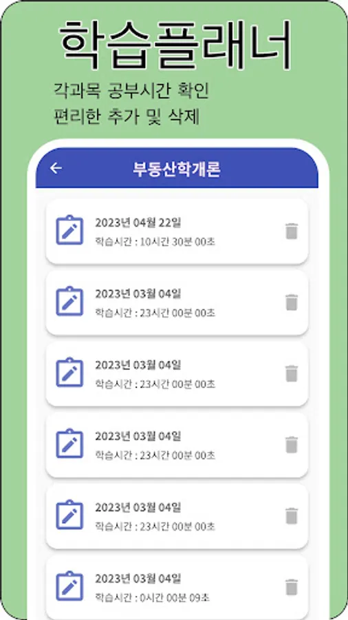 - You can check the study records saved by the real estate agent on a calendar by day, and if you select the corresponding day, you can check the amount of study by subject for each day.
