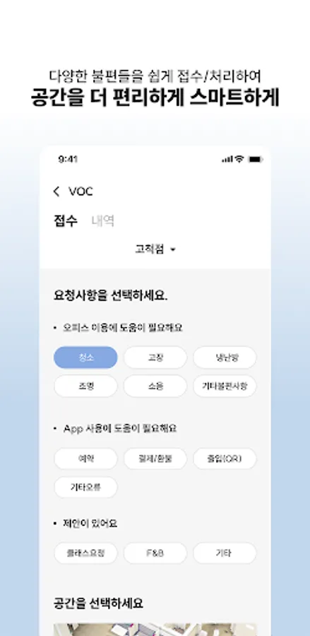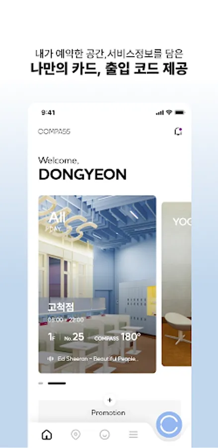 We manage the comfort of the COMPASS space with IoT sensors. Click on My Reservation Card, which you can see right from Home, to check the space management status, including the temperature and humidity of the space, and even the music currently playing.