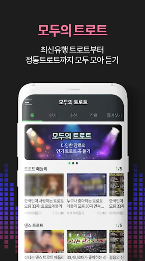 Everybody's Trot supports various functions so that you can hear high-quality trot in any situation, such as continuous listening and continuous playback.