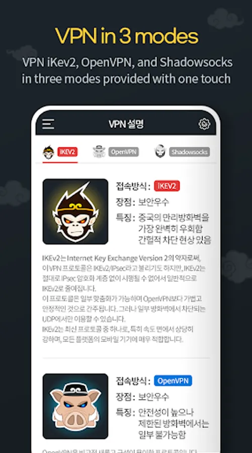 - Monkey VPN has three different ways of connecting: Sonogong, Jeopalgye, and Saojeong.