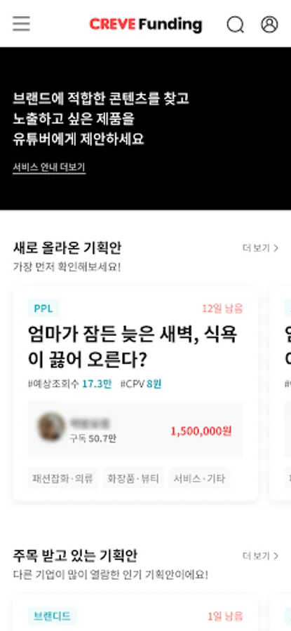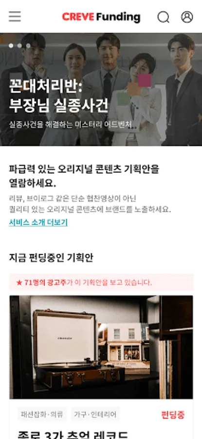 크레브펀딩은 크리에이터와 기업을 기획안 바탕으로 연결시켜주는 플랫폼입니다.
