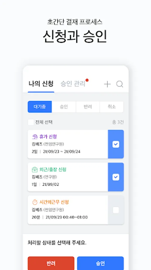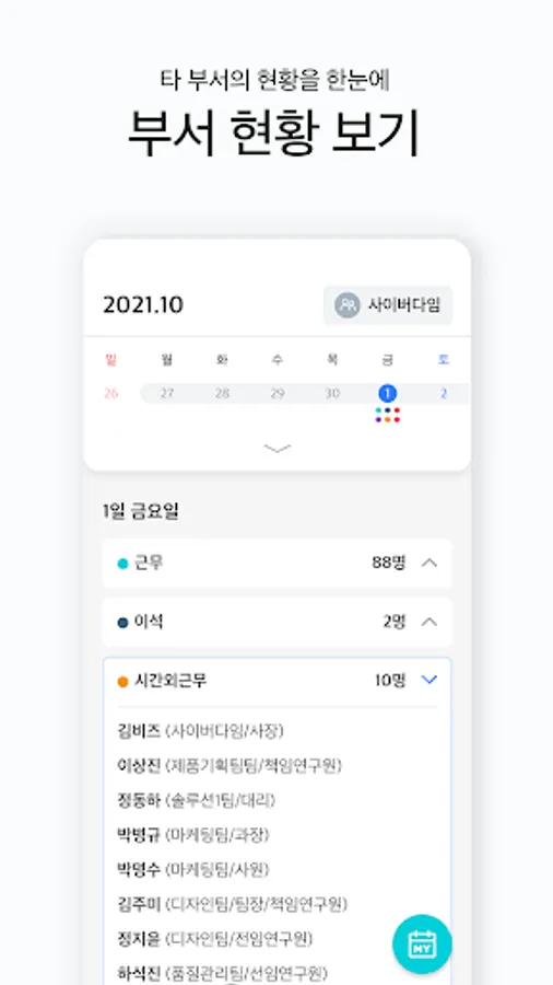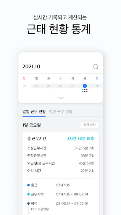 Check the current status of work for the day as well as the monthly status through the calendar. Since attendance is reflected and recorded in real time, it is easy to work in accordance with 52 hours a week.