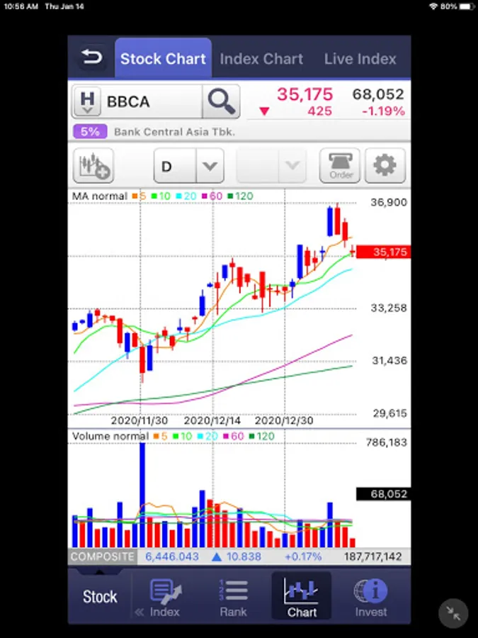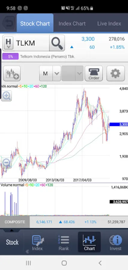 Per Hari / Minggu / Bulan / Menit / Tick dengan berbagai indikator populer (Moving Average, Volume by Price, Ilmok cloud, Bollinger Band, Envelope, Volume, Stochastic Slow, RSI, Disparity).