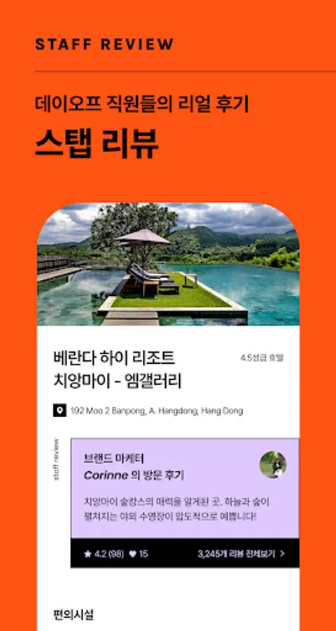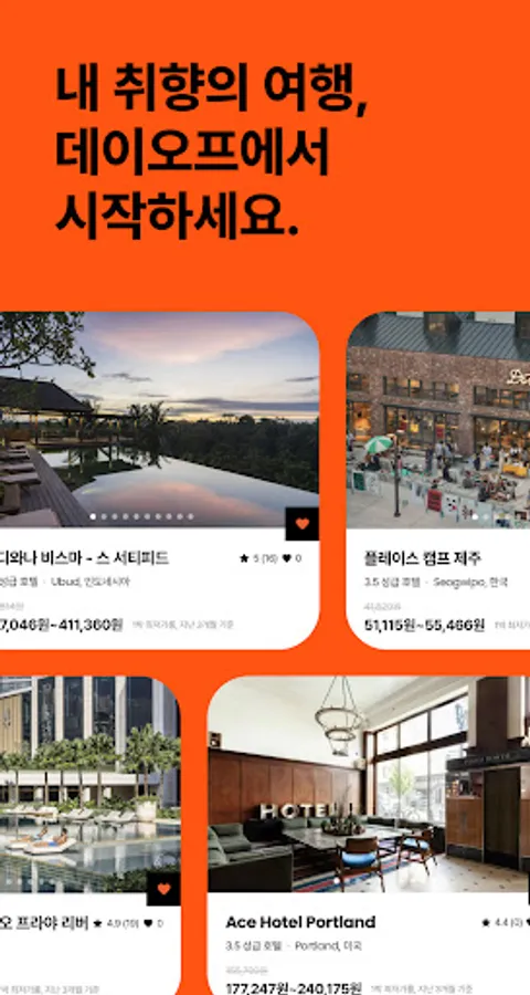 With the Dayoff app, you can make reservations for 250,000 domestic and overseas accommodations, including hotels, resorts, ryokans, pensions, hostels, and guesthouses. From 5-star hotels to guesthouses, from classic to new accommodations, from overseas trips to domestic trips, make a reservation at Dayoff.