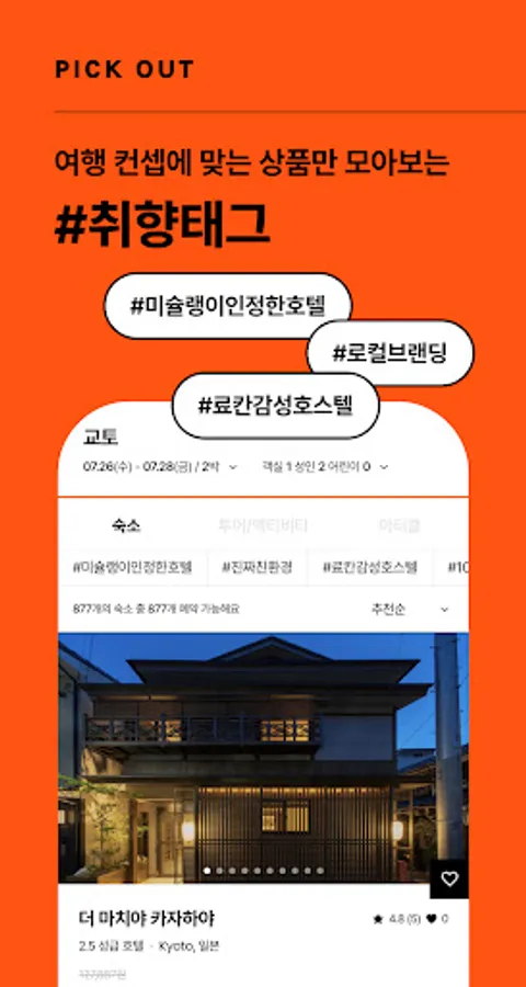 #100 years old ryokan #real eco-friendly #local branding, etc. Click on Dayoff's #taste. You can view only the products that suit your taste. For example, if you search for Kyoto, Japan on the Dayoff app and click the #100-year-old ryokan tag on the list of lodgings in Kyoto, Japan, only authentic ryokans with a 100-year heritage will be displayed. It is good to find products suitable for the travel concept, such as the person traveling with you, the interior and atmosphere, the view and features, etc. You can also check only related travel content.