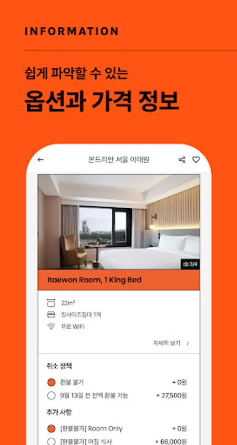 When booking accommodation, you can intuitively select room-specific cancellation policies and additional options. And you can compare the difference in price according to the selection conditions at a glance.