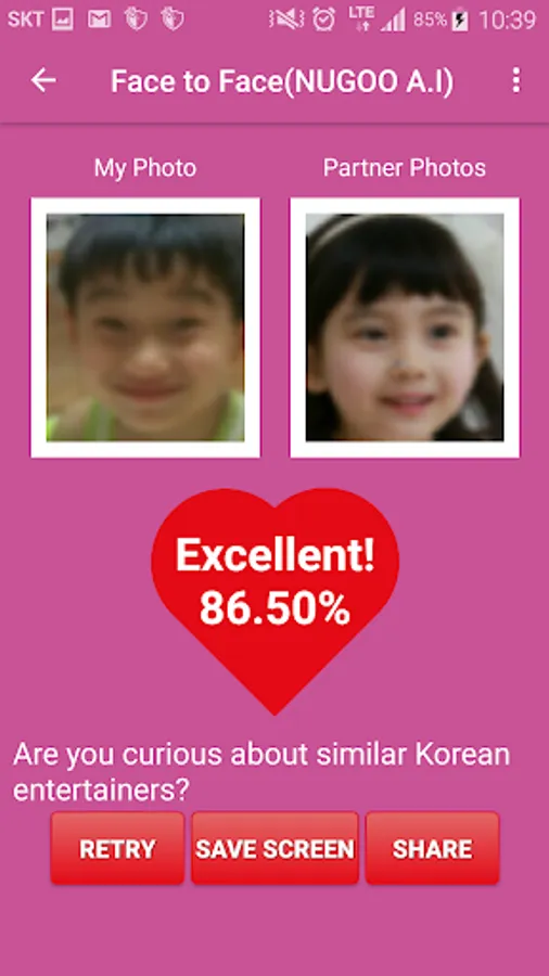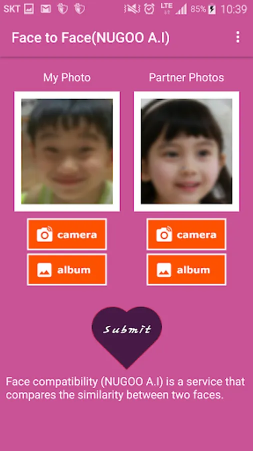 Artificial Intelligence (NUGOO A.I) recognizes the similarity between two faces and artificial intelligence determines the result of face compatibility.
