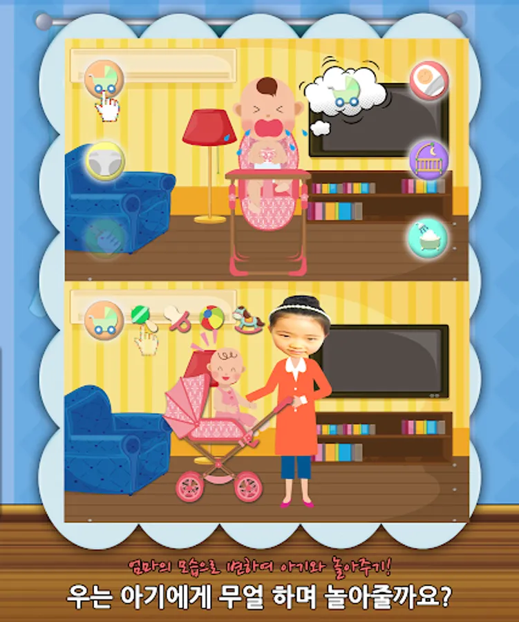 Changing the background, playing, diaper changing, formula feeding, hugging, sleeping, bathing