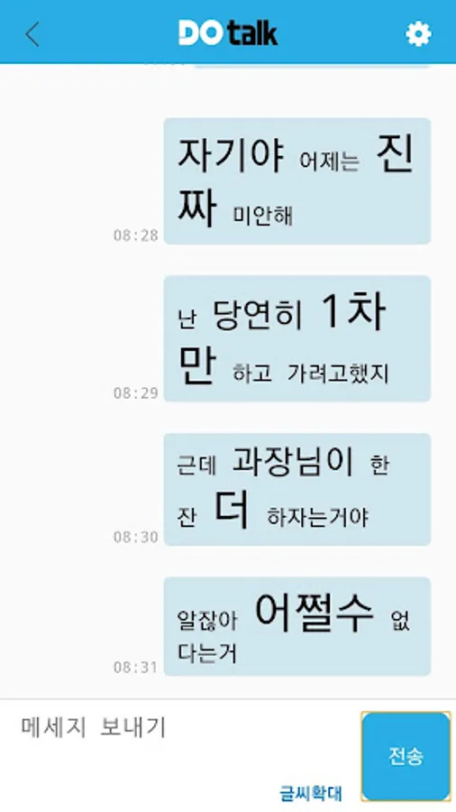 두톡은 상대방과 채팅대화에서 특정 영역의 글자 크기를 여러배 키워 이모티콘과 또다른 감정 전달을 할 수 있는 채팅앱입니다.