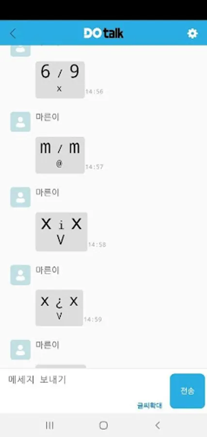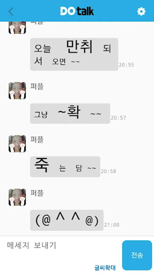 채팅하는 상대방과 대화에서 특정 영역의 글자 크기를 여러배 키워, 예를 들어 "오늘 만나기로 ㅇㅈ?" 이라면 대화 중 오늘 또는 만나기로 혹은 ㅇㅈ 또는 물음표의 글자크기를 여러배 키워 대화의 재미와 또다른 감정 전달을 할 수 있습니다.