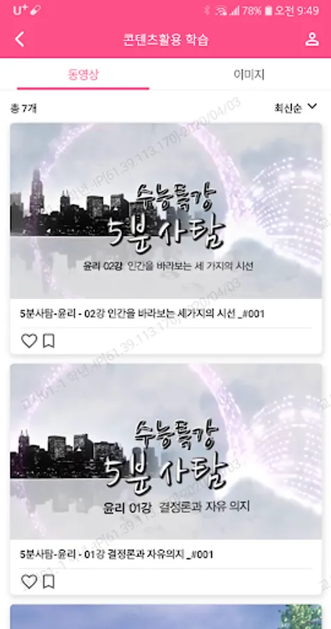 유플러스 원격수업에서 제공하는 콘텐츠 활용 수업은 동영상, 이미지, 문서 콘텐츠를 등록하여