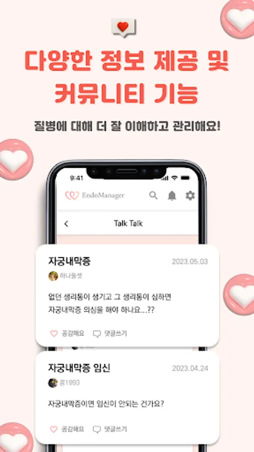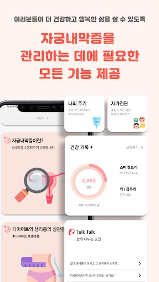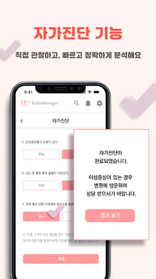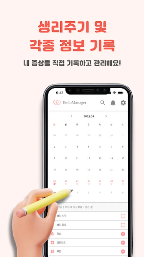 Record and manage your symptoms. Through this, you can directly monitor your health status and use it usefully when talking to medical staff about symptoms. Also, since endometriosis is closely related to the menstrual cycle, the endo manager checks it so that you can predict the menstrual cycle.