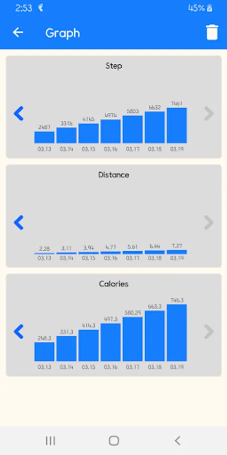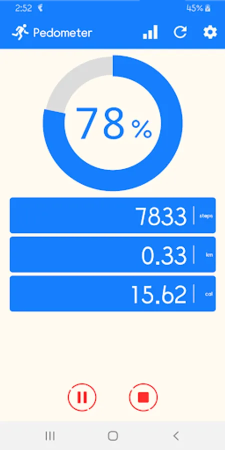 - Shows step count, distance and calories.