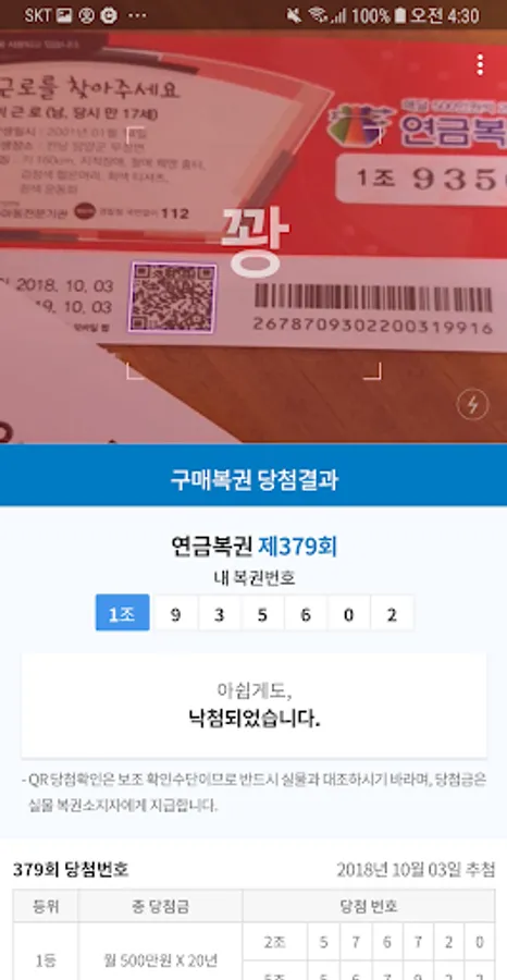 2. Align the QR code of the lottery or pension lottery to the center of the camera.