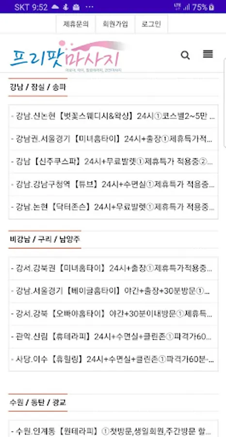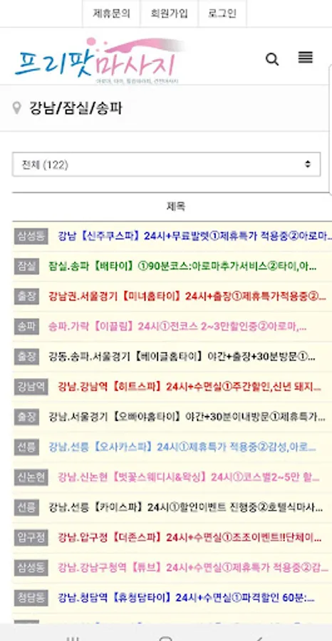 Provides nationwide massage, dry massage, healing, Thai massage, waxing, home thai, and one-man shop information by region and type.