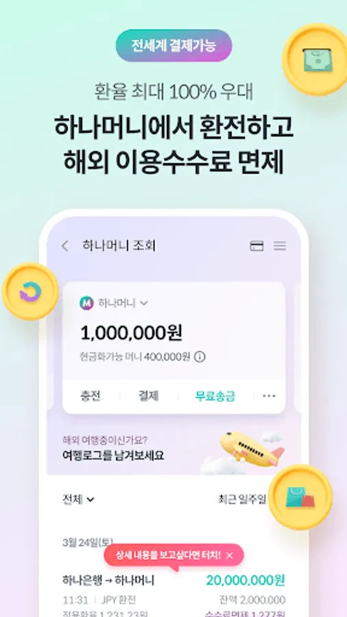Hana Money, which records the details in an easy-to-see manner while resolving payment in 3 seconds for free without account information, easily settling and sharing regardless of won/foreign currency, charging/ATM withdrawal/payment at once, will be the beginning and end of all your daily money.