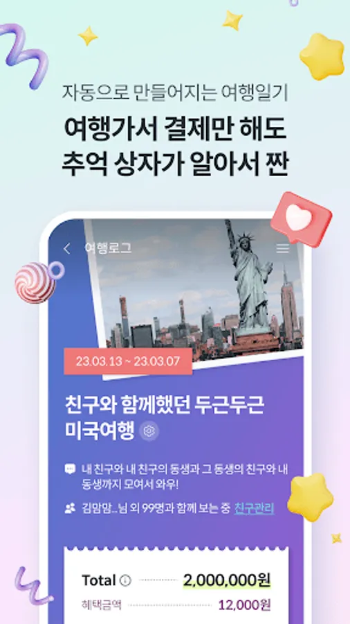 You can exchange 18 currencies for free at the time/exchange rate you want, and you can exempt overseas merchant usage fees, ATM overseas withdrawal fees, and international brand fees with a travel blog card linked to foreign currency Hana Money. Travel log, newly introduced through this renewal, automatically records and reports payment details when traveling abroad, helping you to remember your own or travel together.