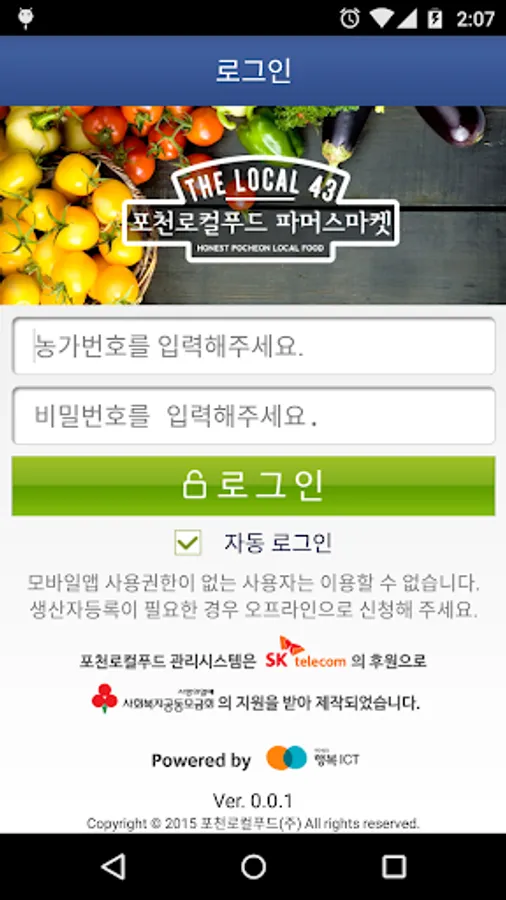 스마트 로컬푸드 시스템의 생산자용 앱의 사용을 원하시는 분은 포천로컬푸드 파머스마켓에 문의해주시기 바랍니다.