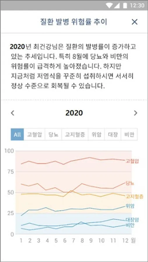 연령별 6대 만성질환 지수와 현재 나의 건강정보를 바탕으로 만성질환 지수 확인