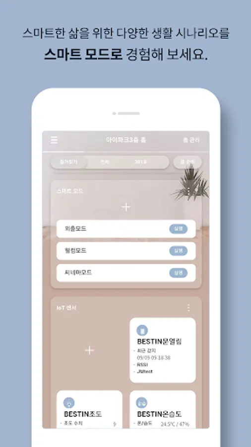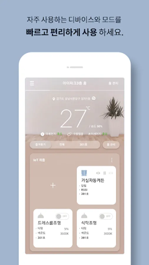 Through purchased and registered IoT devices, you can check the status of your home and members anytime, anywhere, and you can conveniently and smartly use various IoT devices from lighting to sensors for a convenient and safe life according to your lifestyle.