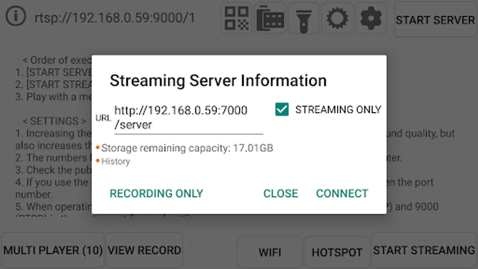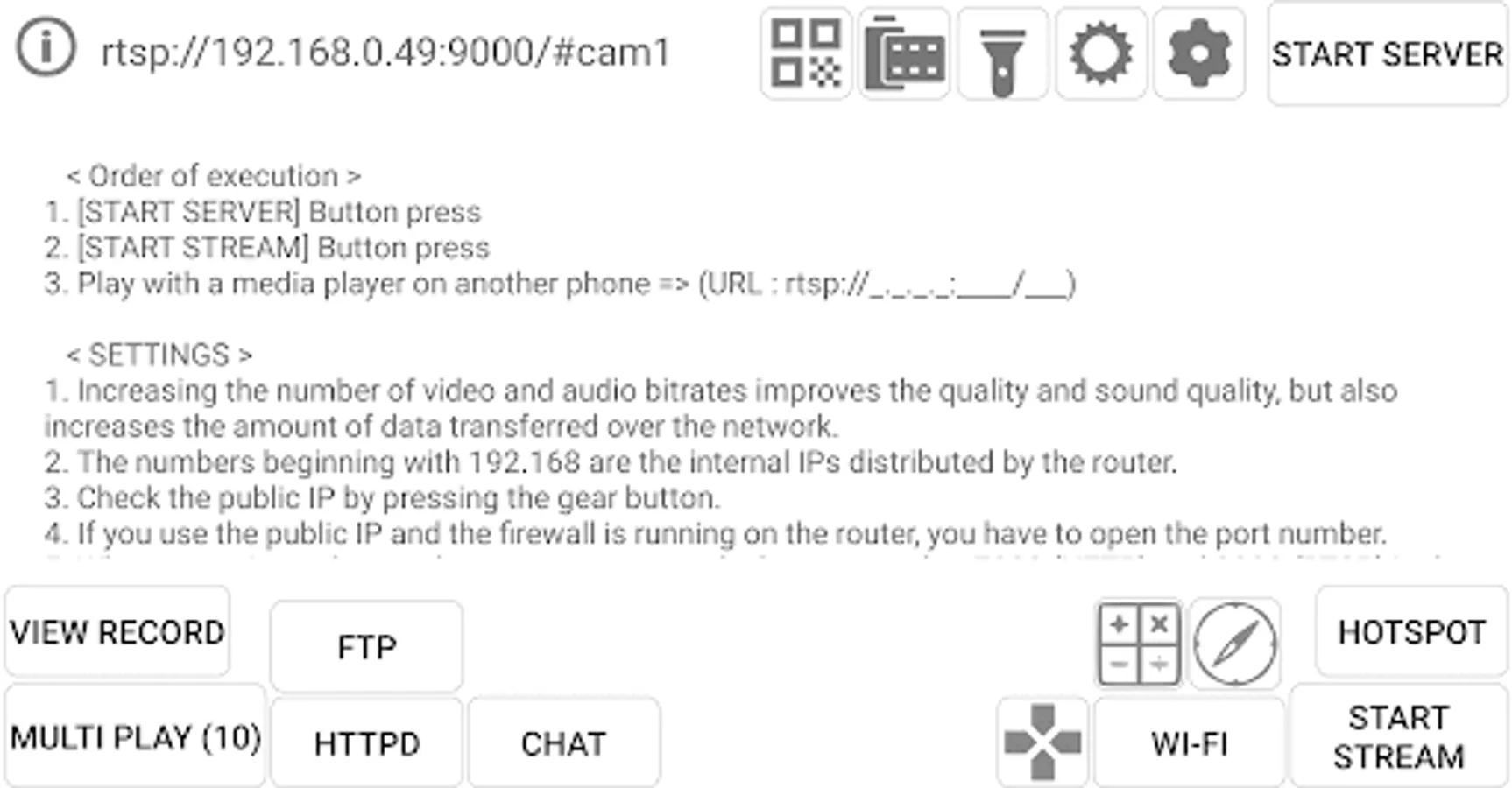 7. If the streaming server is running by pressing the [START SERVER] button, click the [START STREAM] button to start the camera and click the [MULTI PLAY (10)] button to view the video.