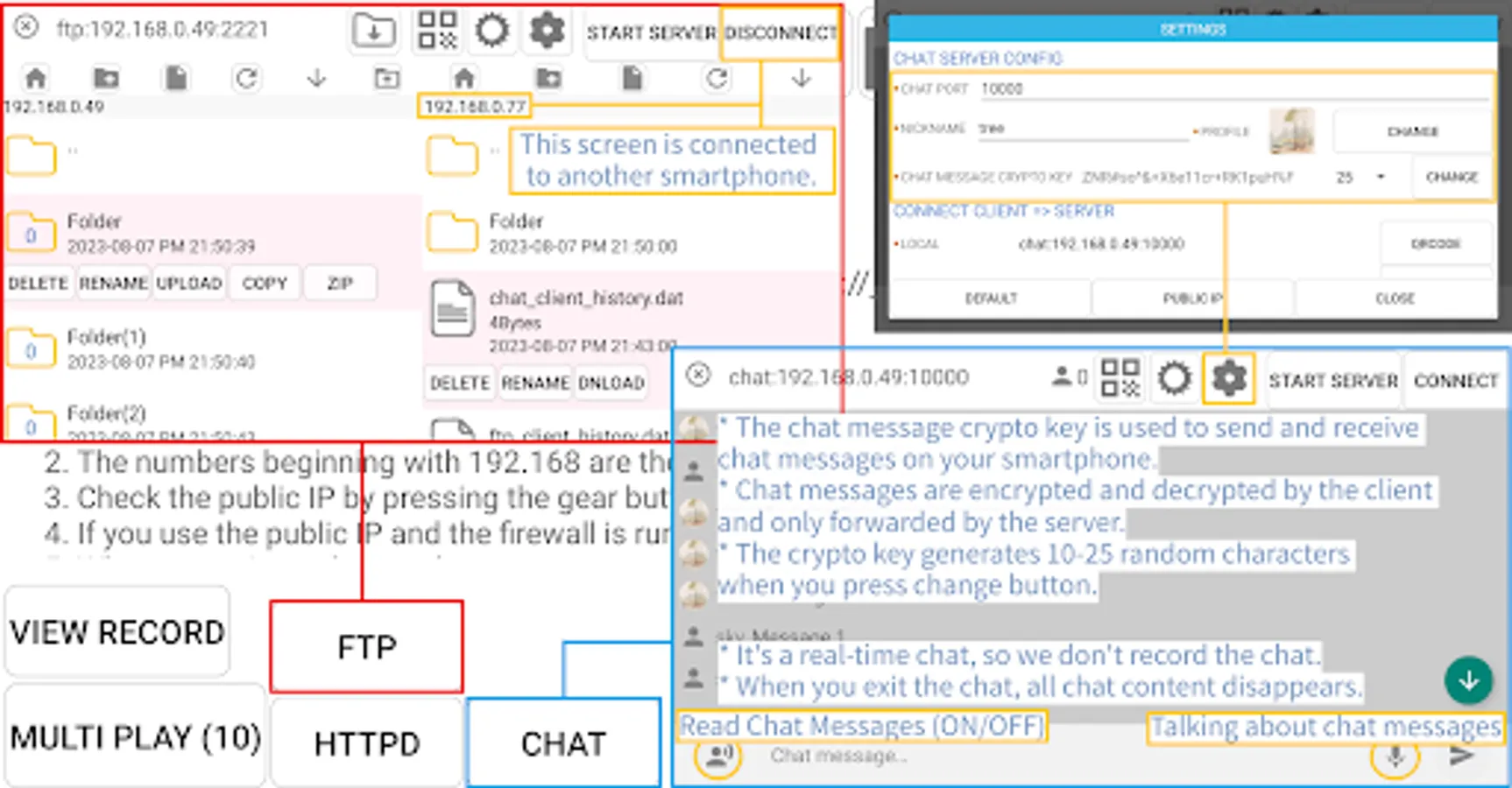 11. Provides real-time chat with Wi-Fi or mobile hotspots without an external Internet connection.