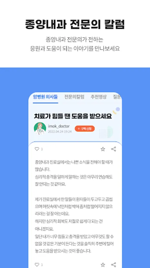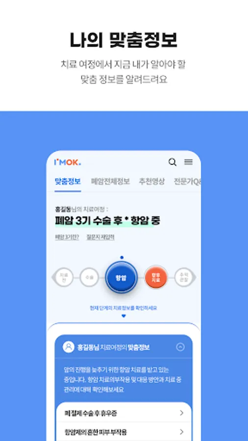 Everything a cancer patient needs to know! is a customized ‘cancer information’ platform for patients suffering from cancer, created by medical staff specializing in oncology at Asan Medical Center in Seoul, by stage and treatment journey, and provides reliable ‘cancer treatment information’.