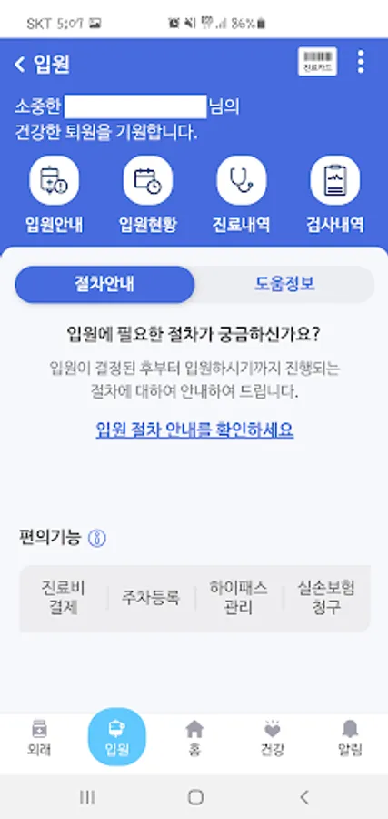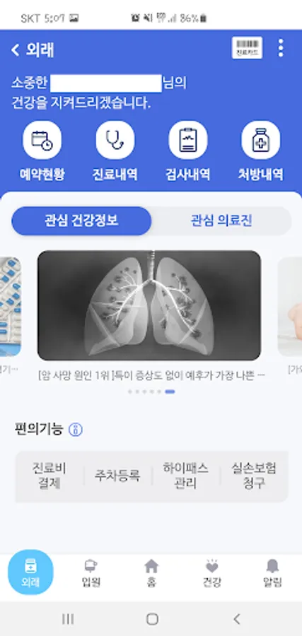 Various services such as medical reservation, payment, treatment and examination history, prescription history, parking registration, etc.