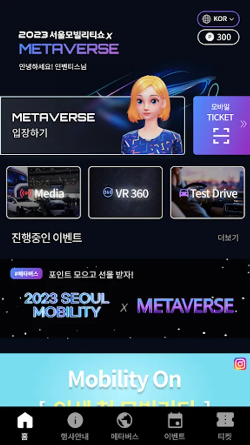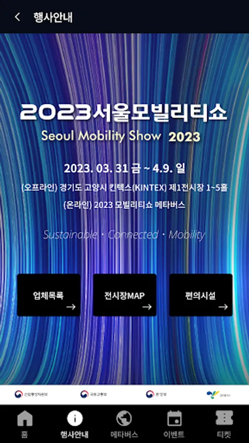 A mobile app that implements the Seoul Mobility Show as a metaverse and allows visitors to experience various exhibition contents such as various new cars and future mobility in a 3D virtual space.