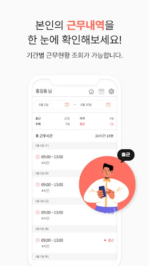How much time and attendance (employee) is an app that allows you to record time and attendance records when you press the go to work or leave button at the user's designated workplace in the manager app, how much time and attendance. You can record your commute at an exact location through GPS and Wi-Fi addresses. By setting the date, you can also check the work records for that period at a glance. Now go to work, leave work easily, quickly and accurately in a short time!