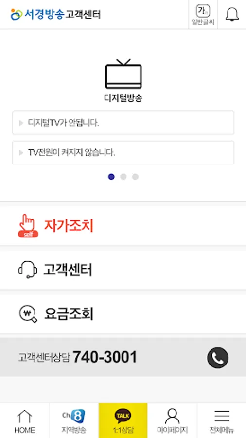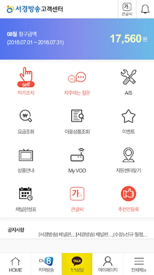 서경방송 가입자의 요금조회, 내상품조회, A/S신청, 서경방송 실시간방송, 채널편성표, 이벤트, 지원센터찾기, 공지, 제휴카드, 자주하는 질문 등의 메뉴를 통해 가입자의 편의를 제공합니다.