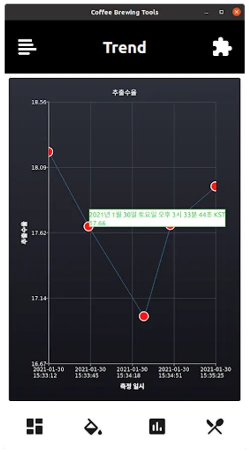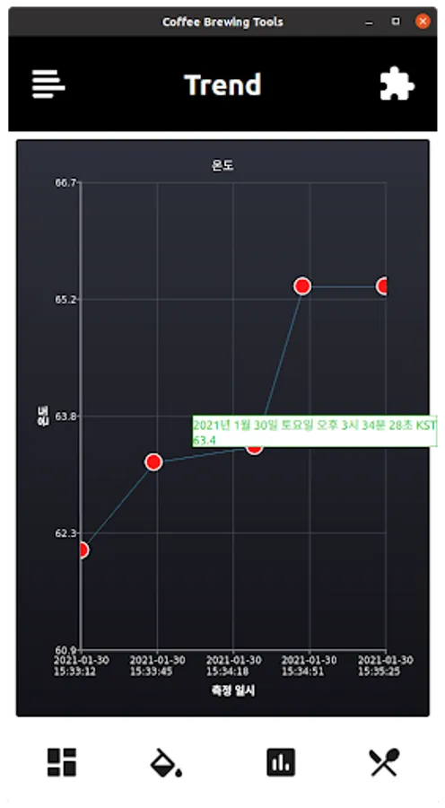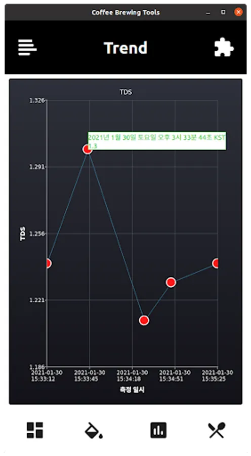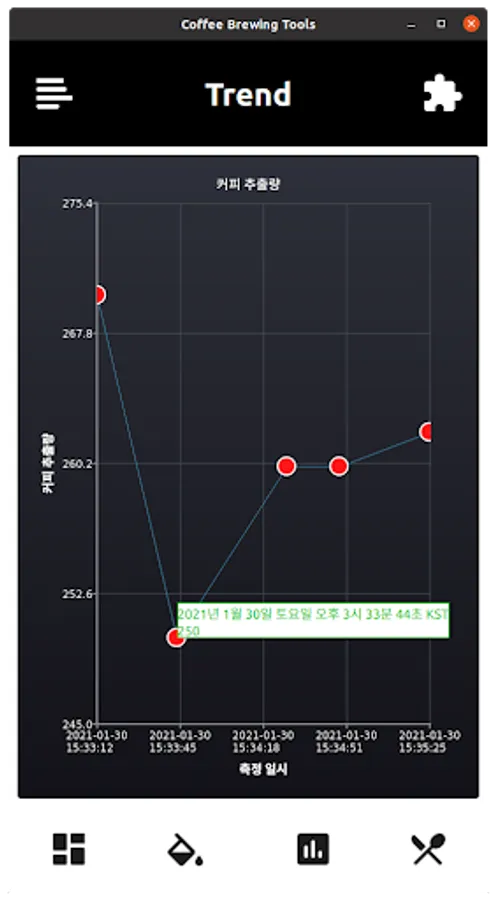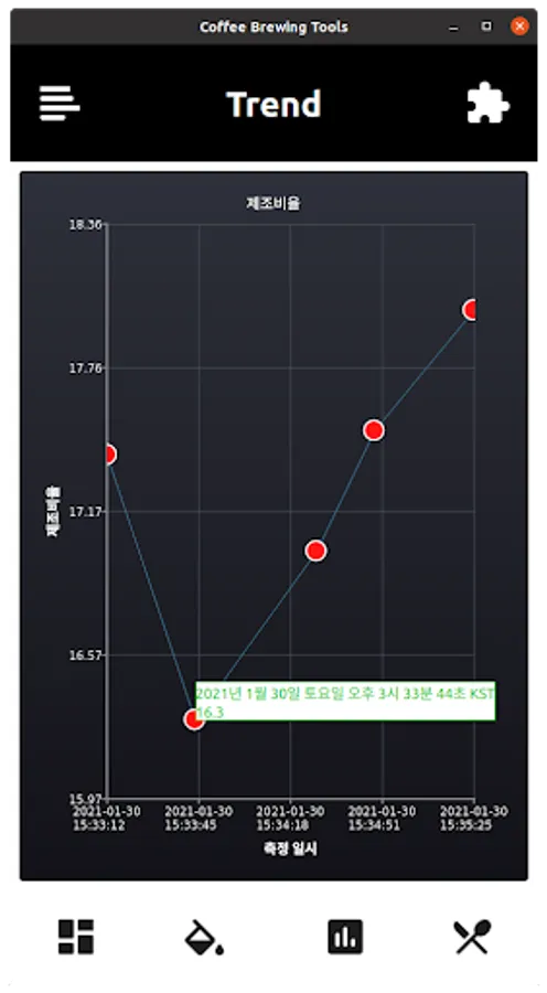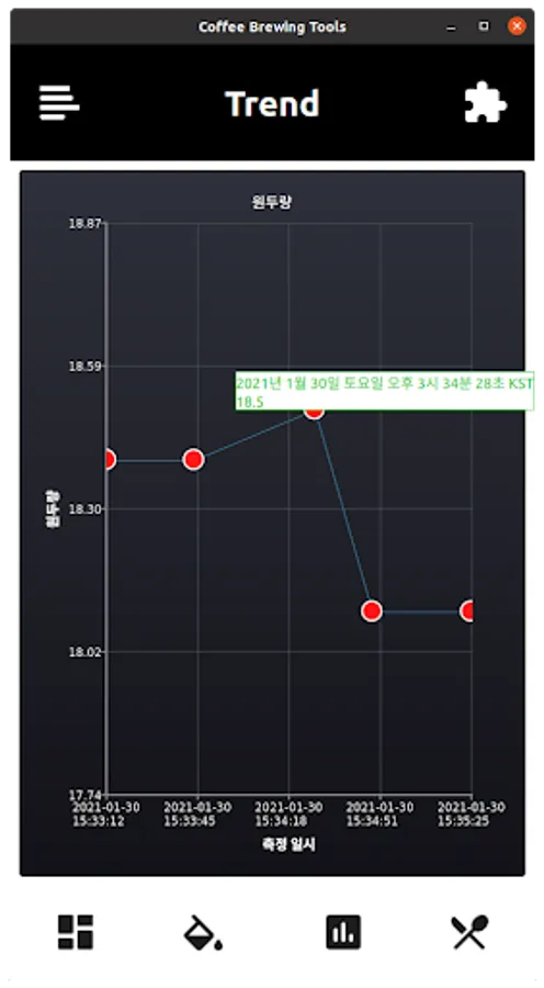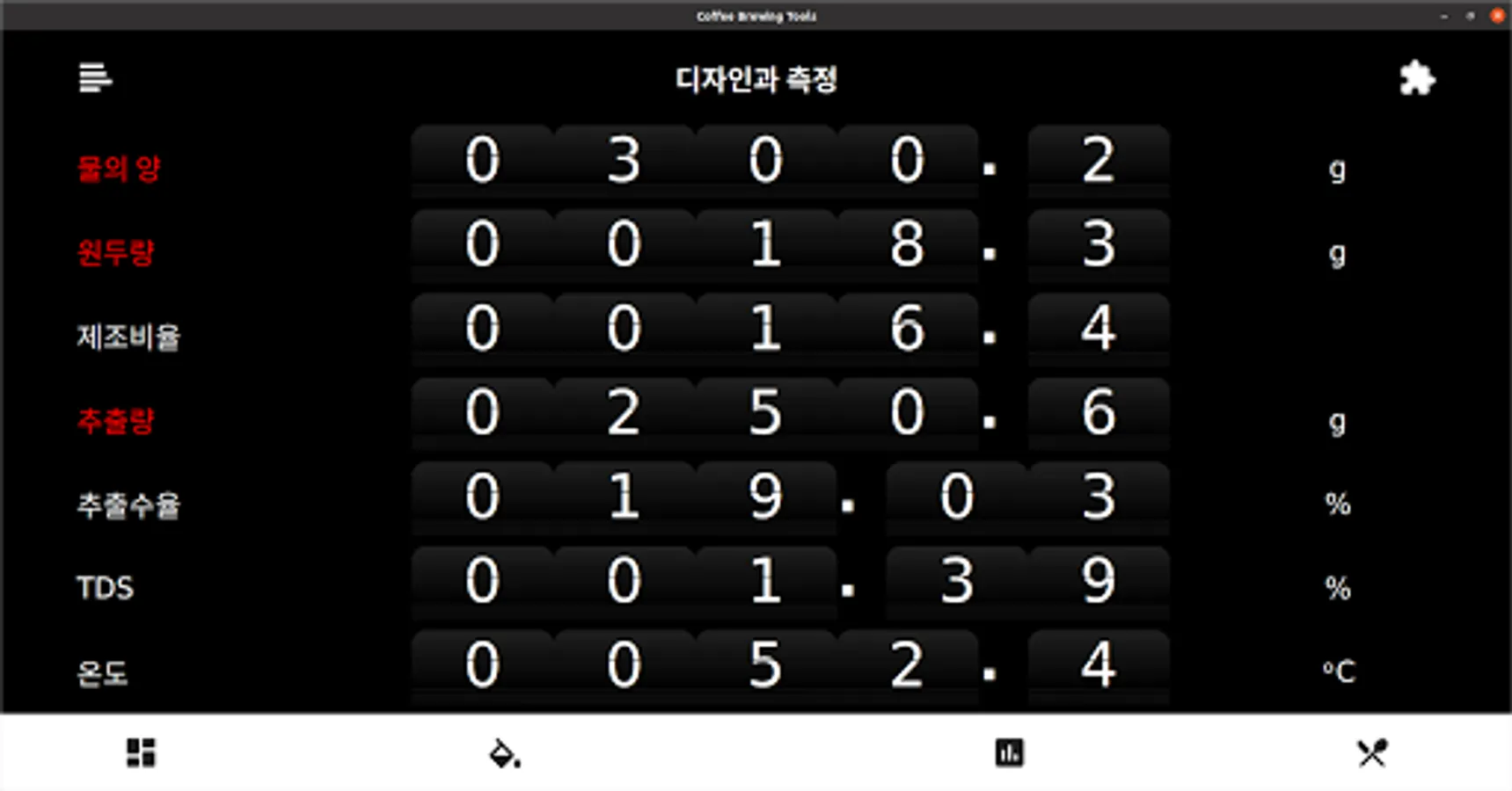 1. In the design and measurement screen, the user enters the amount of water, amount of coffee beans and amount of coffee brewed.