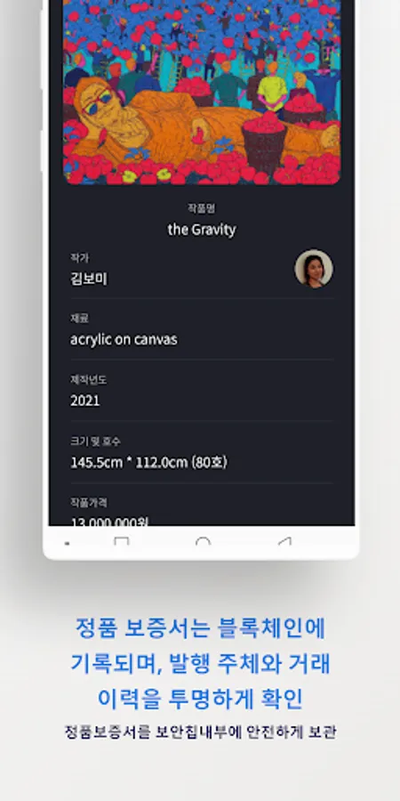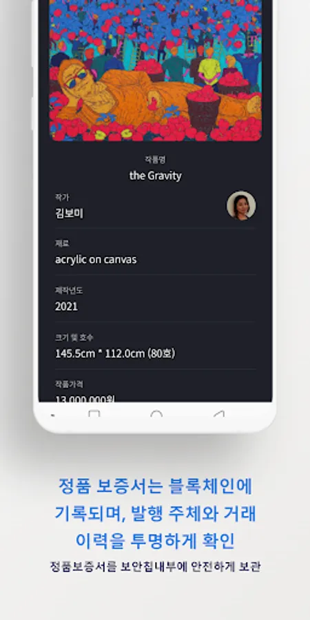 The authenticity certificate is recorded on the blockchain, and the issuer and transaction history are transparently verified.