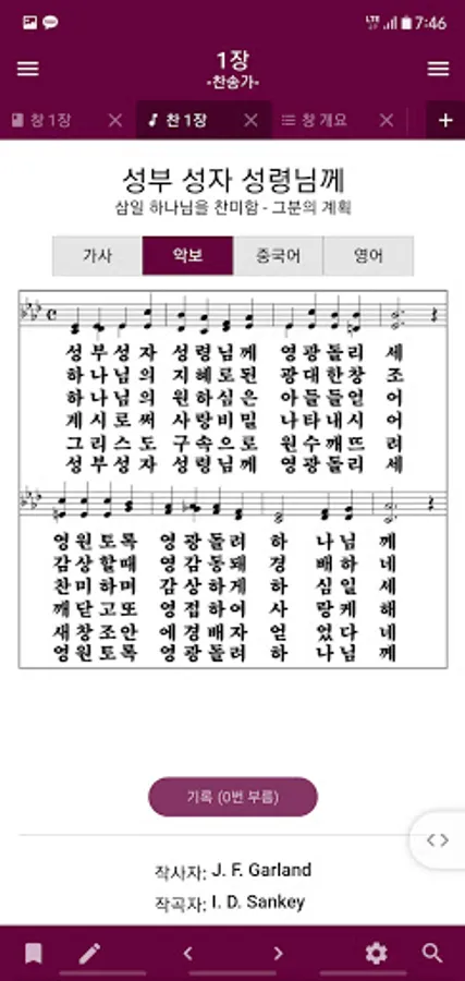 8. We provide 1144 hymns published in the Korean Gospel Book, and a collection of new hymns such as Songs of My Heart, English hymns, and Chinese hymns, along with music scores.