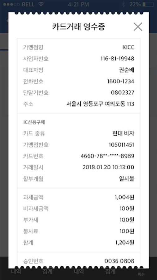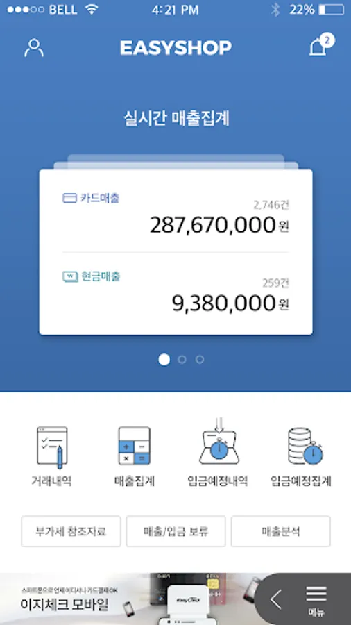 한국정보통신 이지체크 가맹점에서 카드,현금 매출내역을 실시간으로 확인하고,