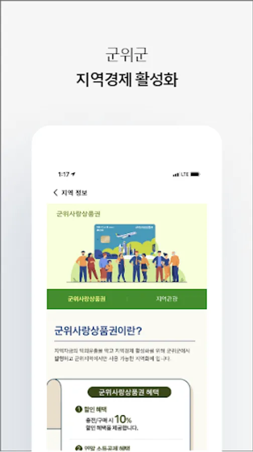 Local currency issued by Gunwi-gun, Gyeongsangbuk-do to revitalize the local economy, has a branch type (10,000 won, 5,000 won) and a rechargeable prepaid card type.