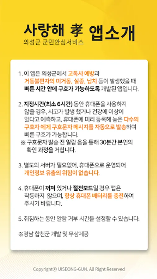 This app is for the elderly 65 years of age or older with mobility difficulties, the disabled, dementia patients, severely ill, single households, kindergarteners, elementary, middle and high school students, etc. It is a safety service app developed to prevent damage by sending text messages or warnings (sound, vibration, etc.) to
