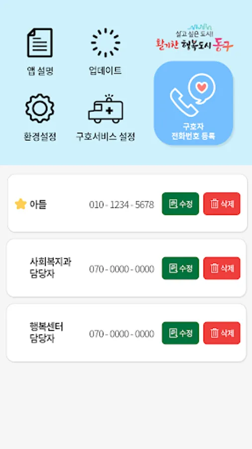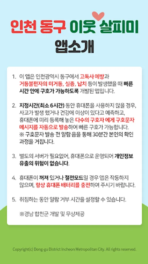 This app is for the elderly over 65 years of age with reduced mobility, the disabled, dementia patients, severely ill people, etc., as well as single-person households, kindergarteners, elementary, middle and high school students, etc. It is a relief service app developed to prevent damage by sending text messages or warnings (sounds, vibrations, etc.)