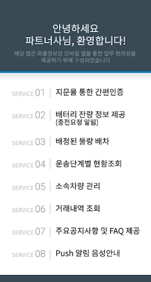 It is an application that provides the service to make the vehicle dispatch more convenient and faster in real time by the partners and provides the progress and status of the transportation status in real time.