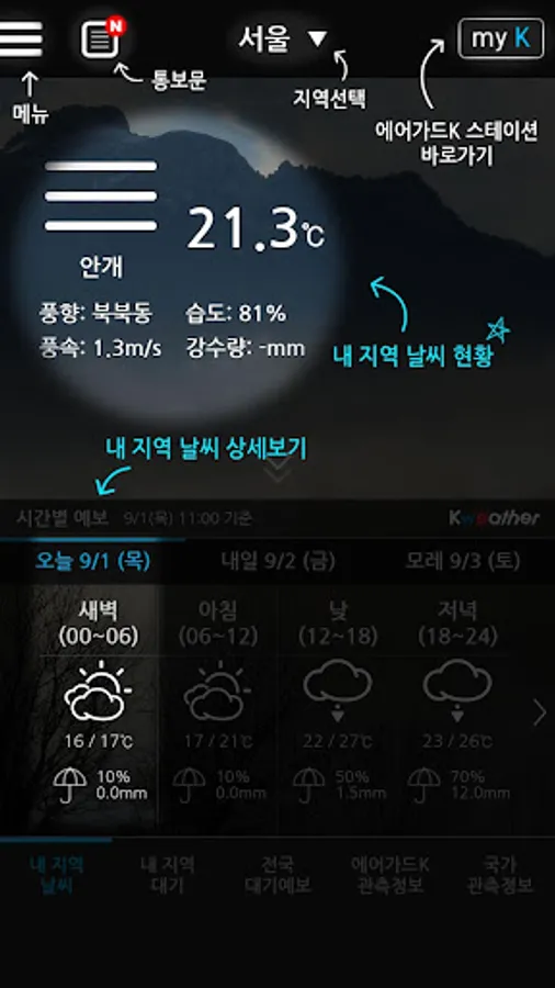 - As K-Weather's own forecast, it provides two-day forecasts of fine dust / ultrafine dust / yellow dust / ozone / ultraviolet light for 17 regions nationwide. In addition, you can check more detailed waiting information through the notice issued twice a day.