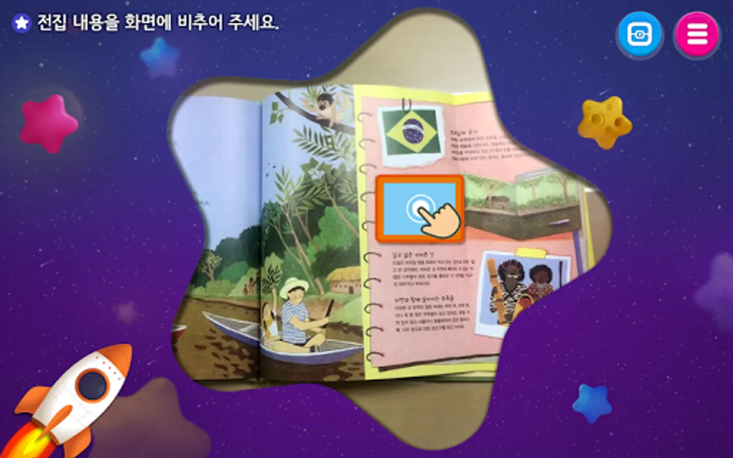 2. Photographing: Light up the page with the ‘image recognition icon’ of each book of knowledge collections that glows with the teacher's thoughts on the camera screen. When you illuminate the picture, the content appears on the screen.