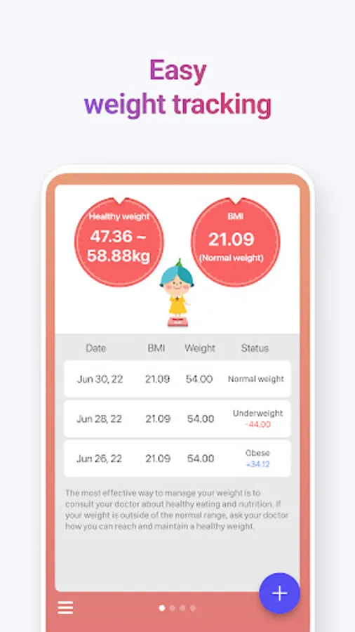 No more complicated weight trackers! Simply enter your weight, and the app will show you the healthy weight range and BMI. Achieve your weight goals with Bom Calendar!